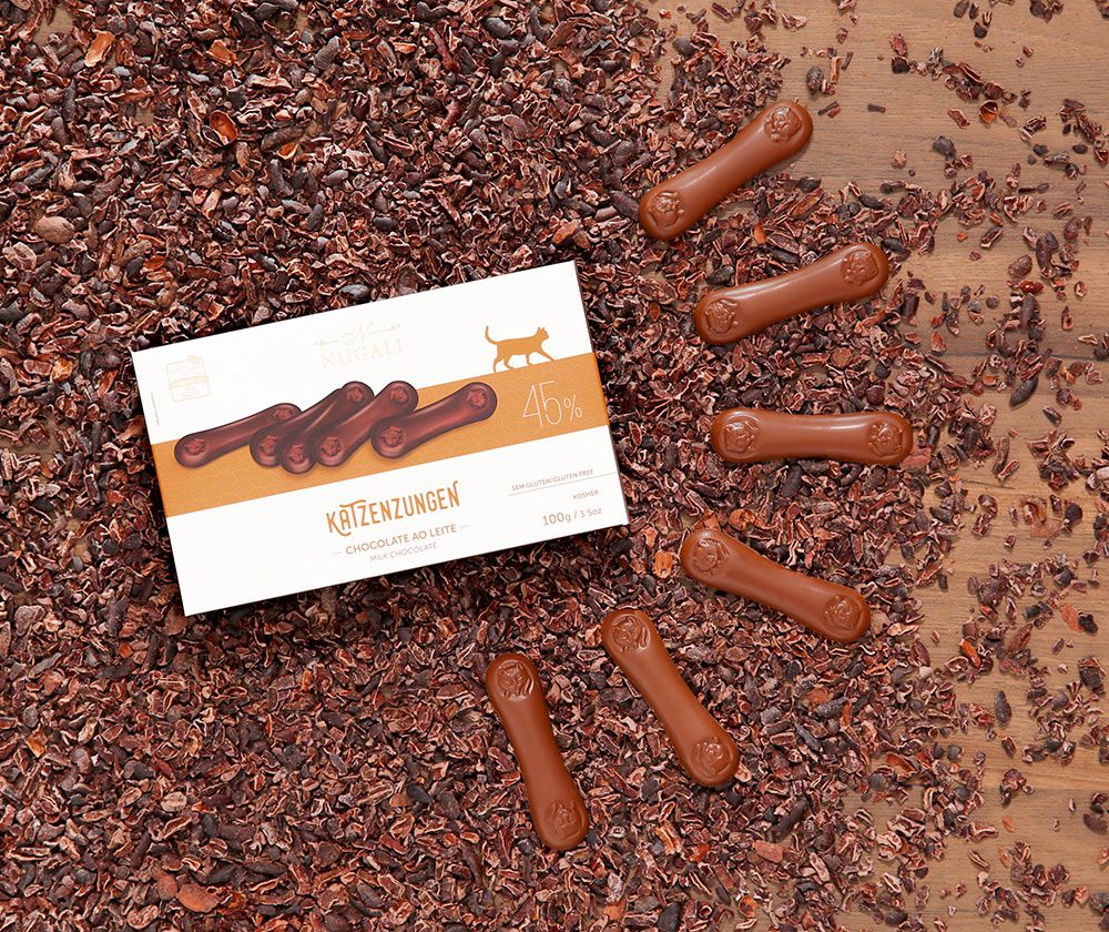 A Katzenzungen ao Leite é feita com o premiado chocolate ao leite 45% cacau, eleito o melhor chocolate ao leite das Américas.
